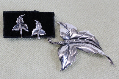 DANECRAFT sterling pin and earrings with marcasites, leaf
