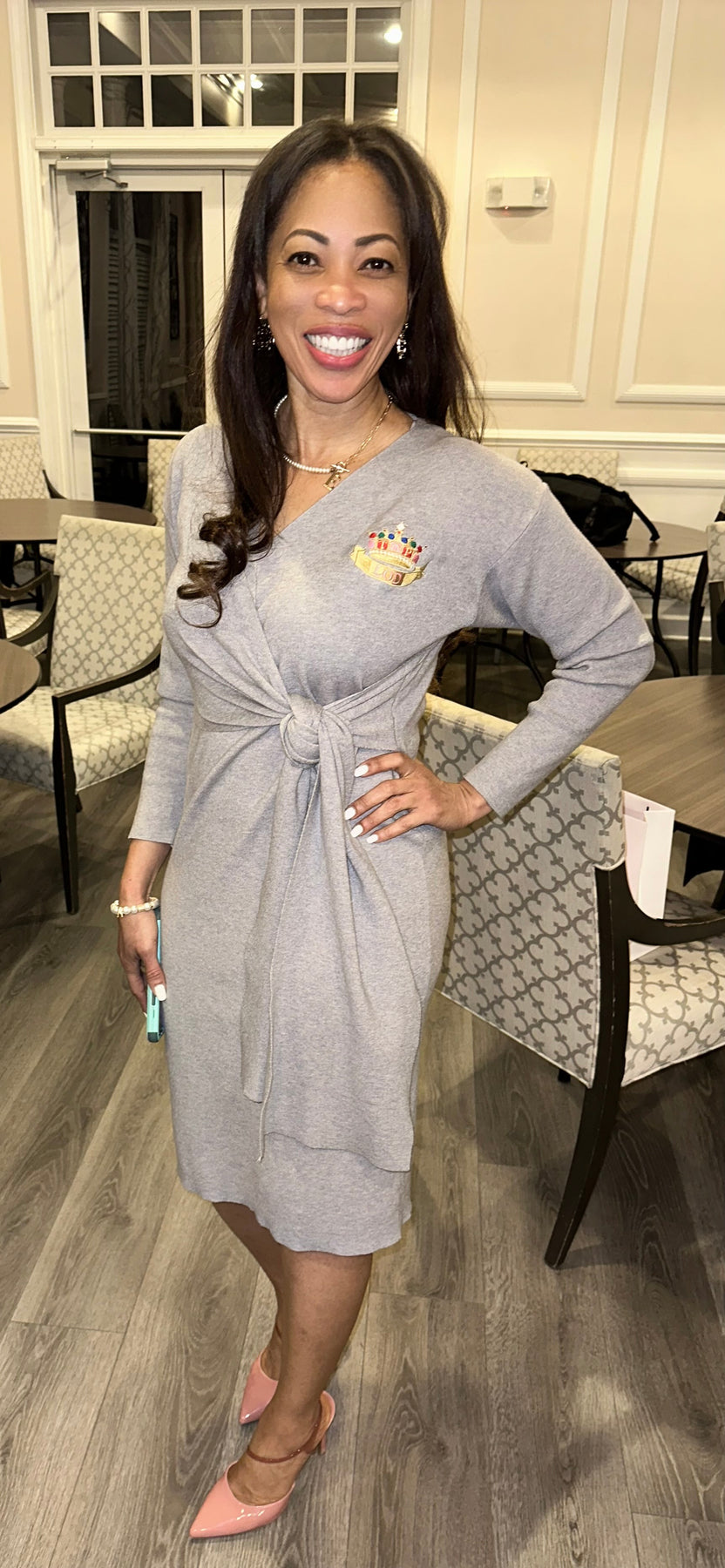 Our Shay dress. The perfect wrap dress. Featured in this timeless grey color. Made beautifully with high quality blended knits: rayon viscose, nylon, poly and span. Long sleeve, front v-neck and front wrap tie. Knee length. Easy relax fit. Super soft and comfy. Very stylish and chic.
