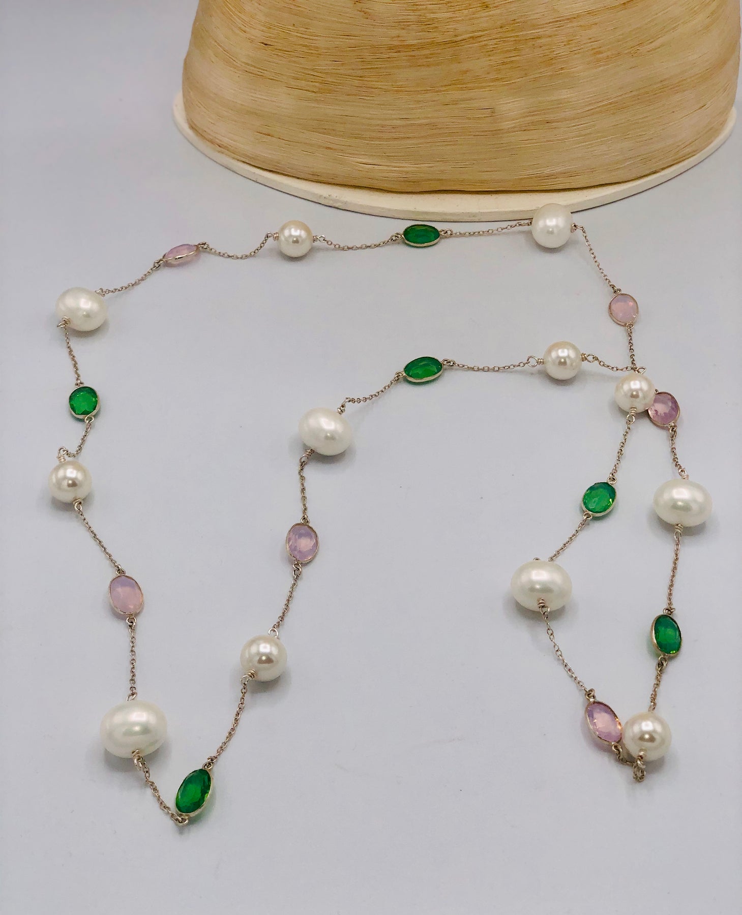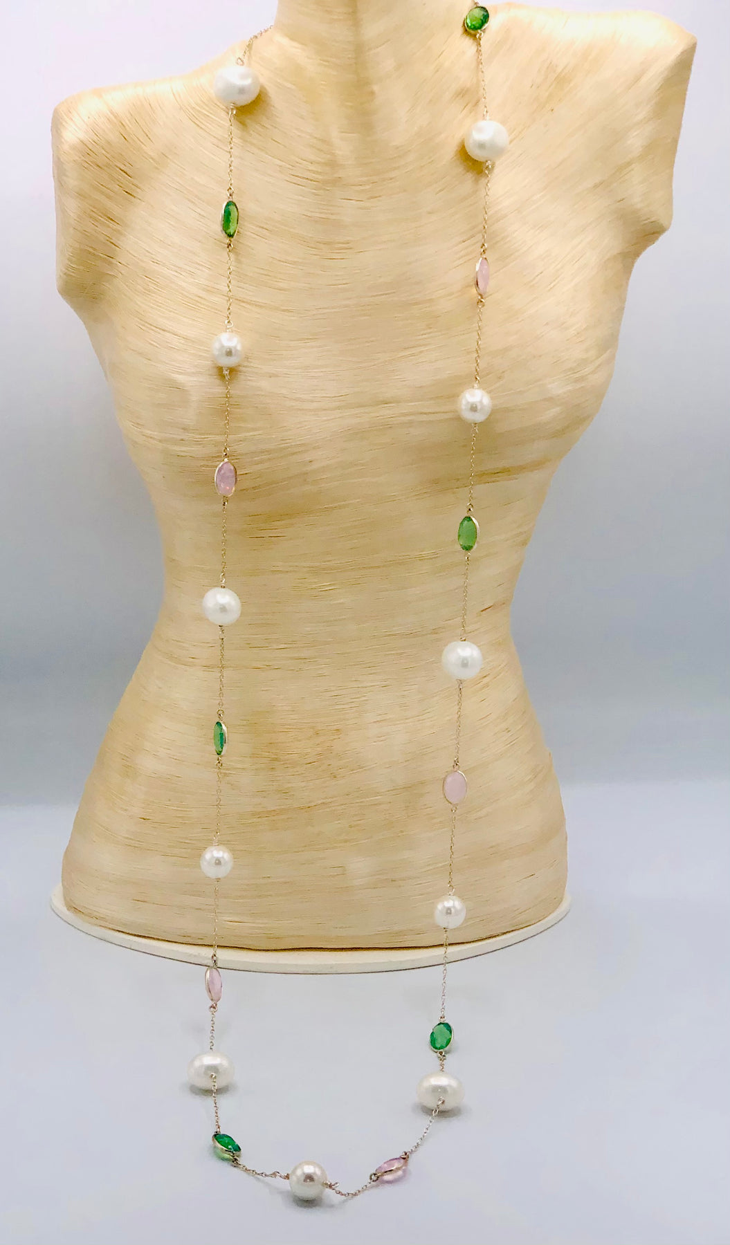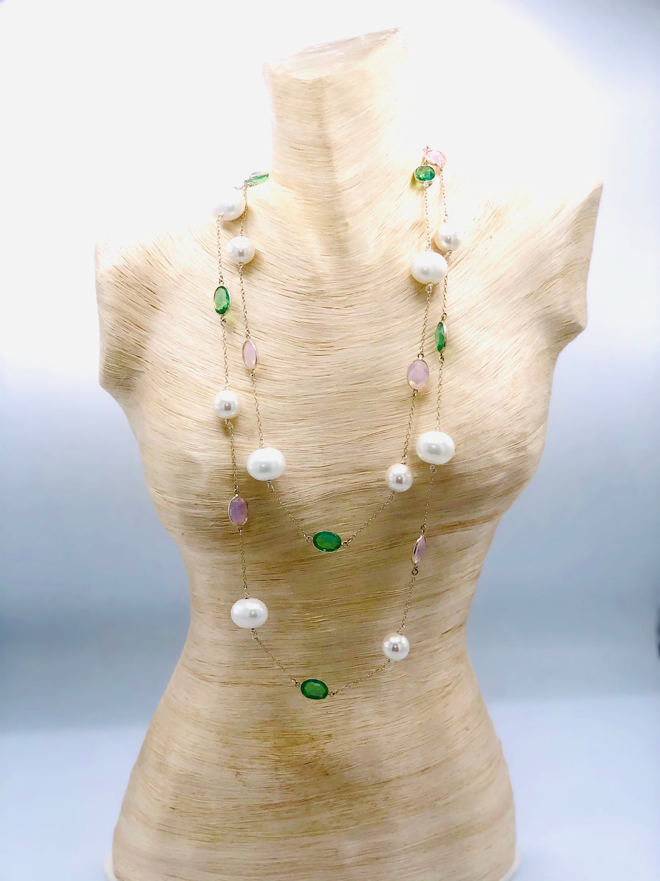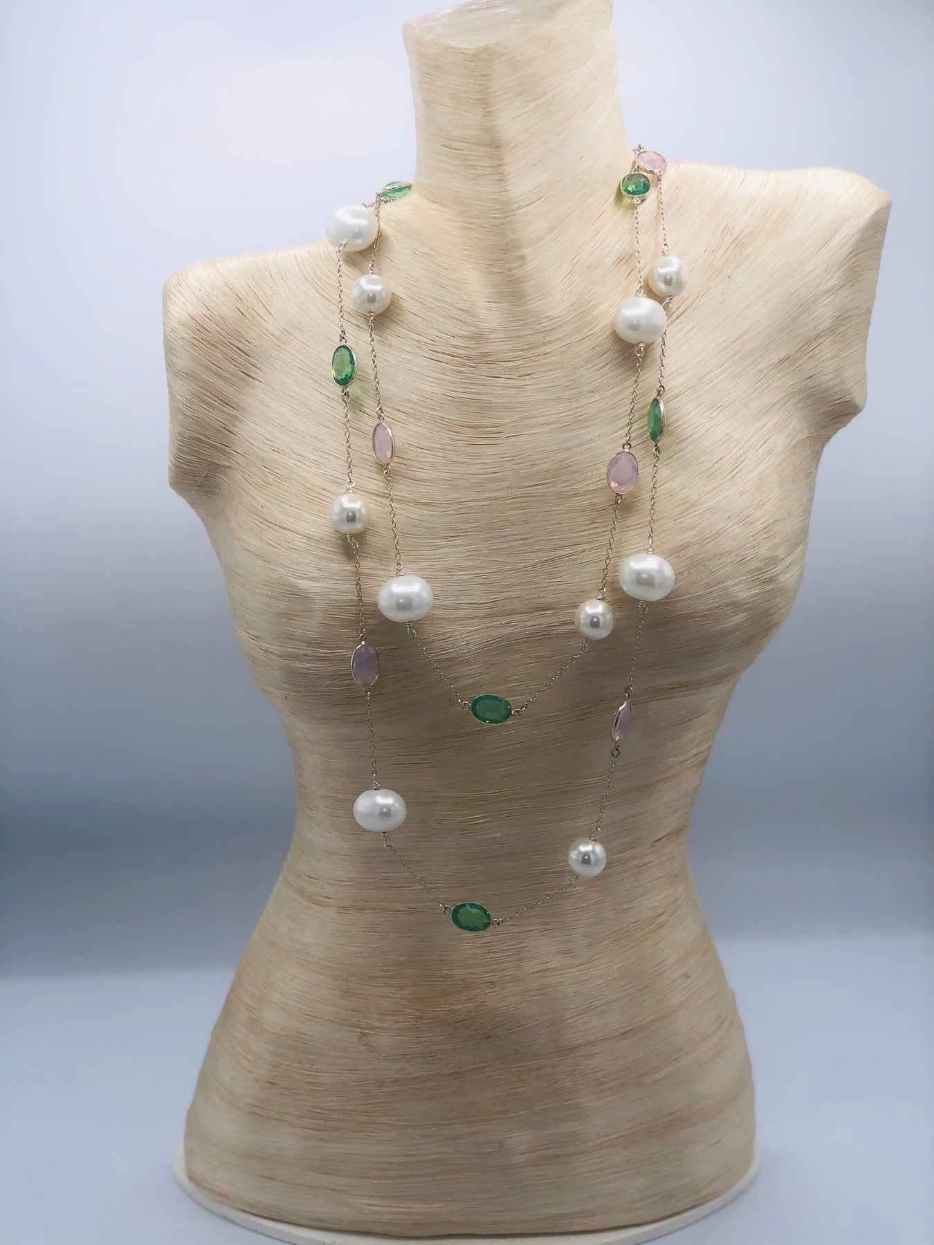 Emerald, Rose Quartz and Sterling Silver. 24 inches