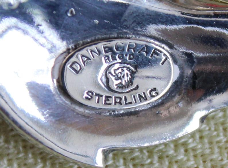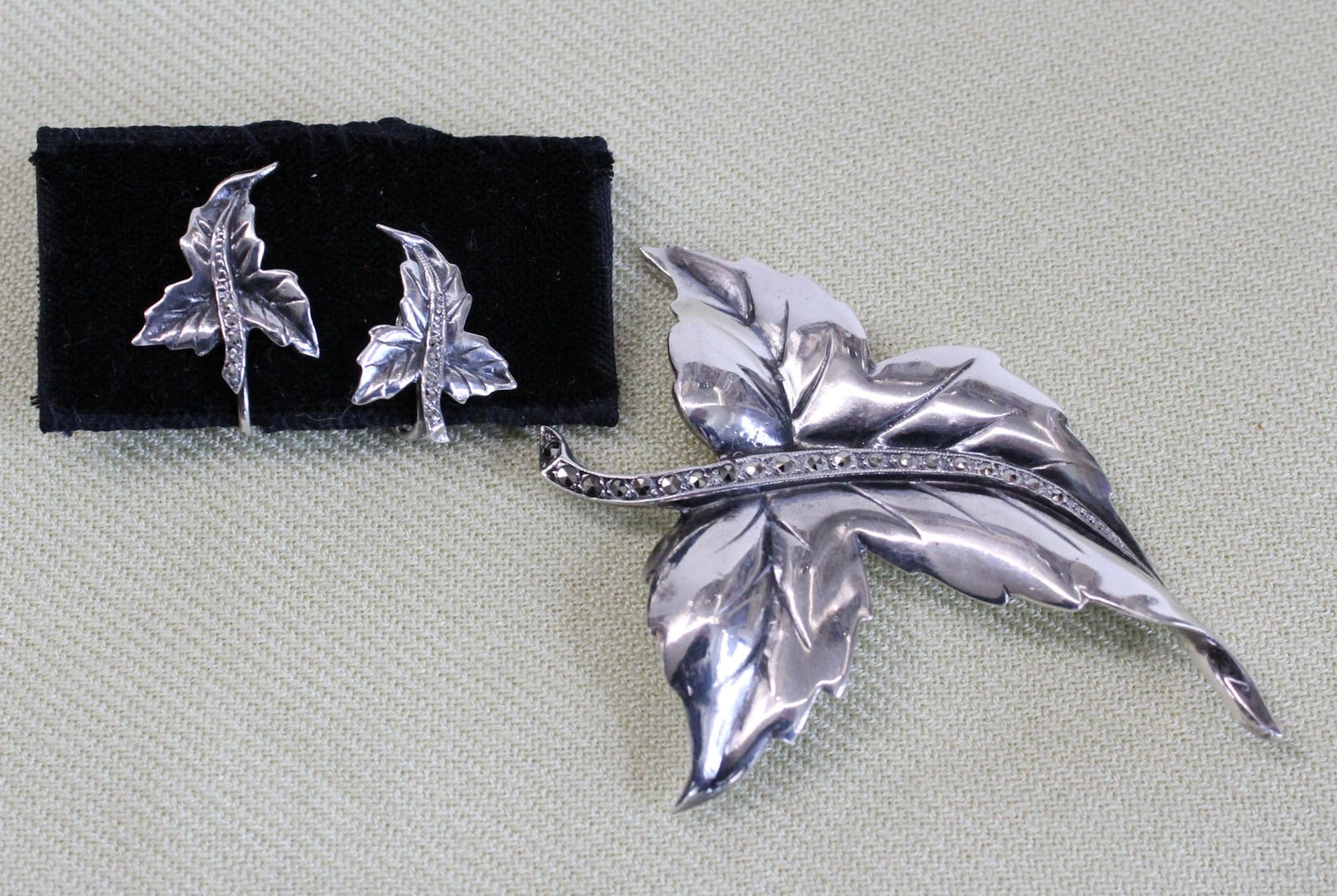 Danecraft is a quality silver jewelry manufacturer. This sterling DANECRAFT set is a leaf pin with matching screw-back earrings. The center of each piece features a row of marcasites.