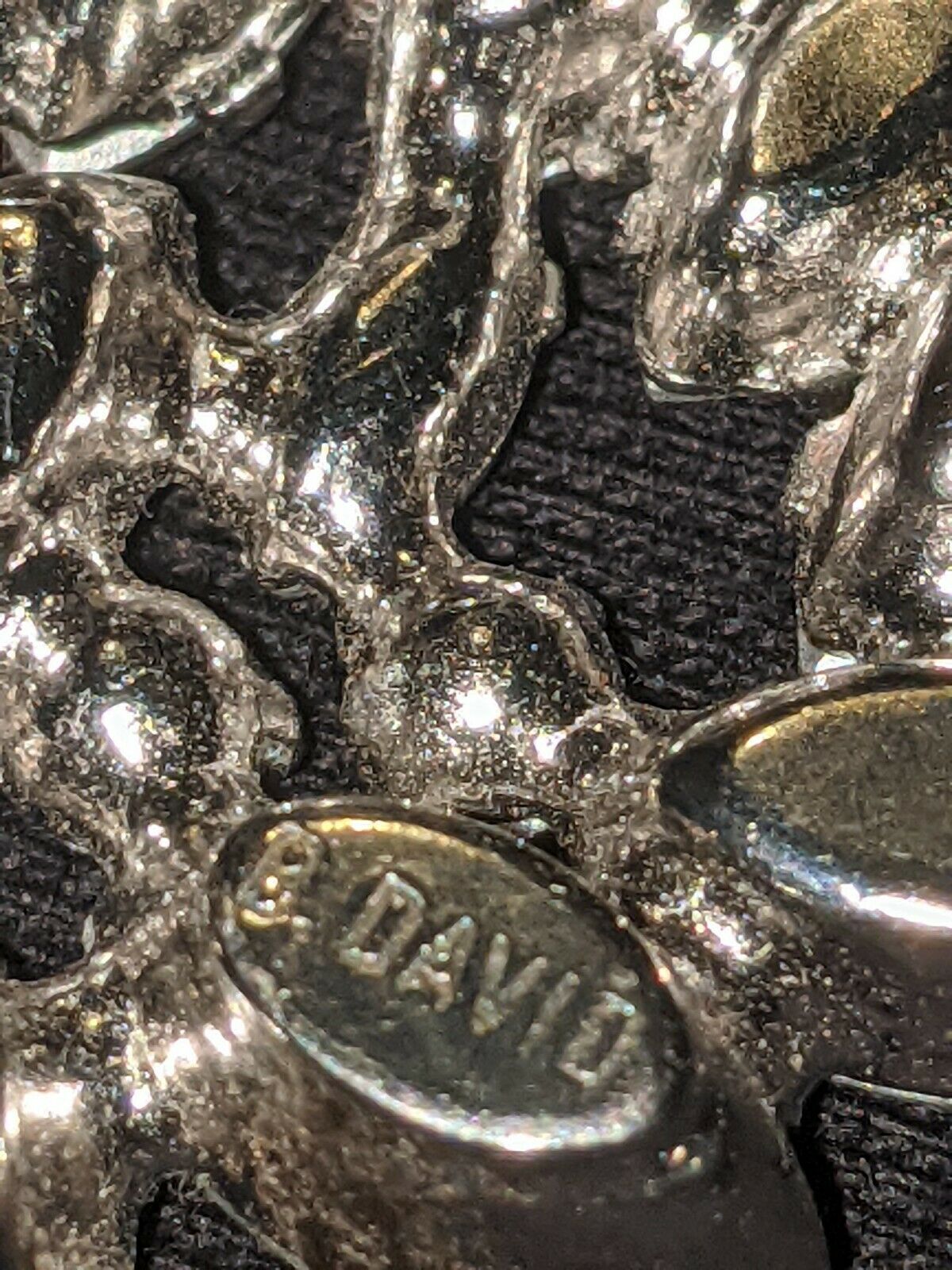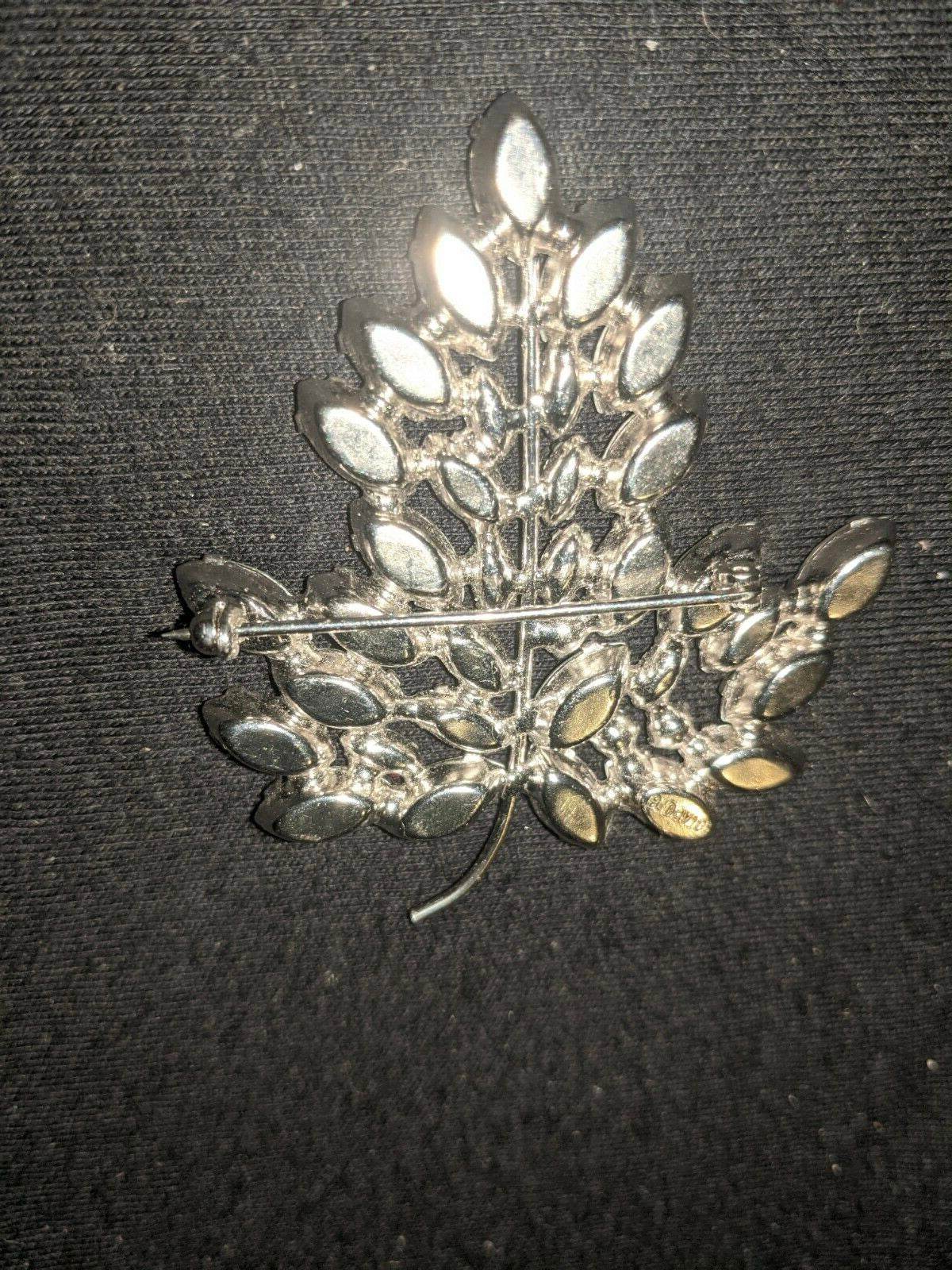 Vintage Signed B. David Aurora Borealis Rhinestone Leaf Brooch/Pin.  It is in nice condition with bright colors. 1 3/4" by about 2" long.