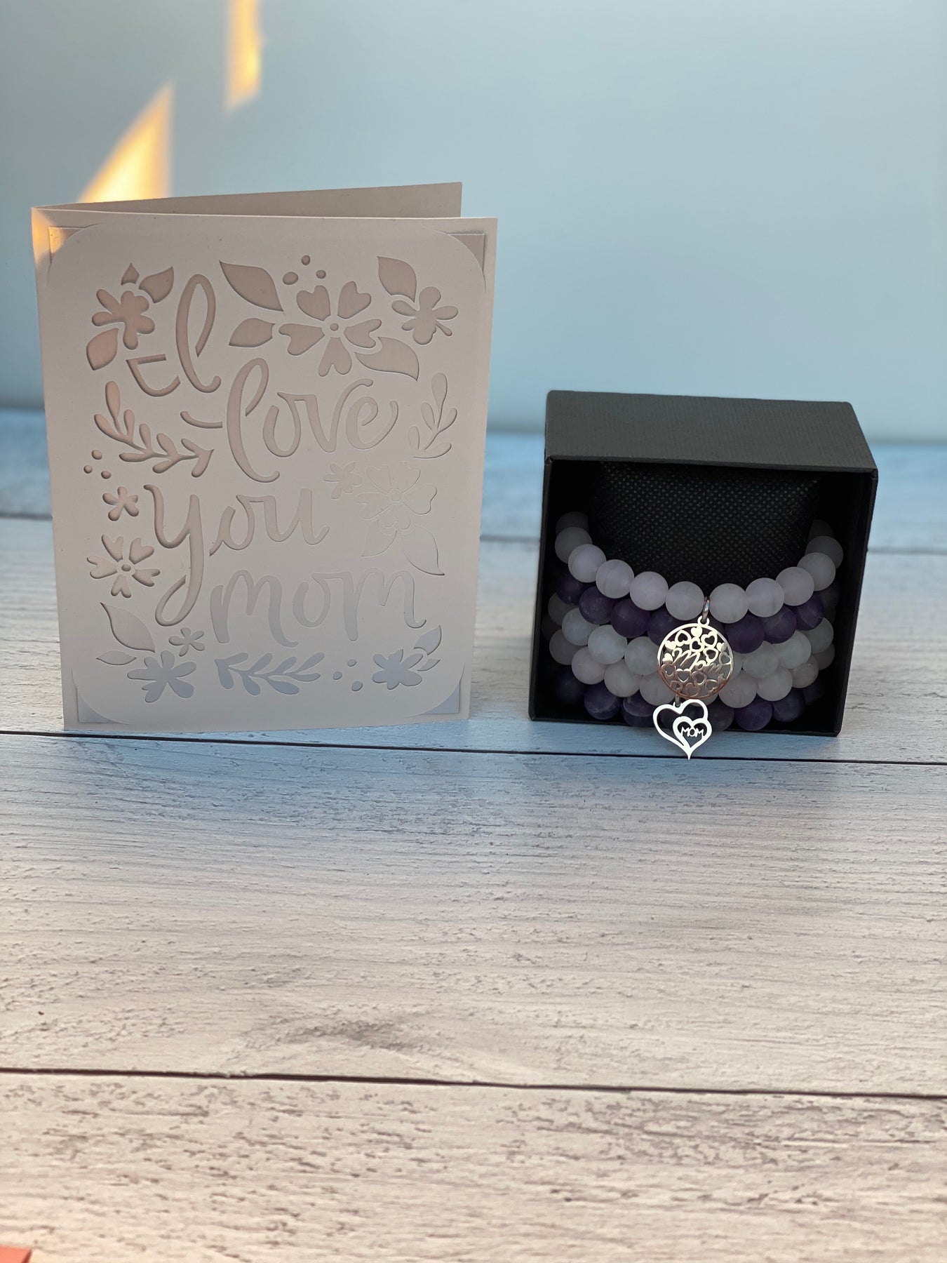 Natural Gemstone Beads Stretch Bracelets, with Natural White Jade, Frosted Natural Rose Quartz and Frosted Natural Amethyst, Packing Box, Two Stainless Steel Mother Charms. Card not included.