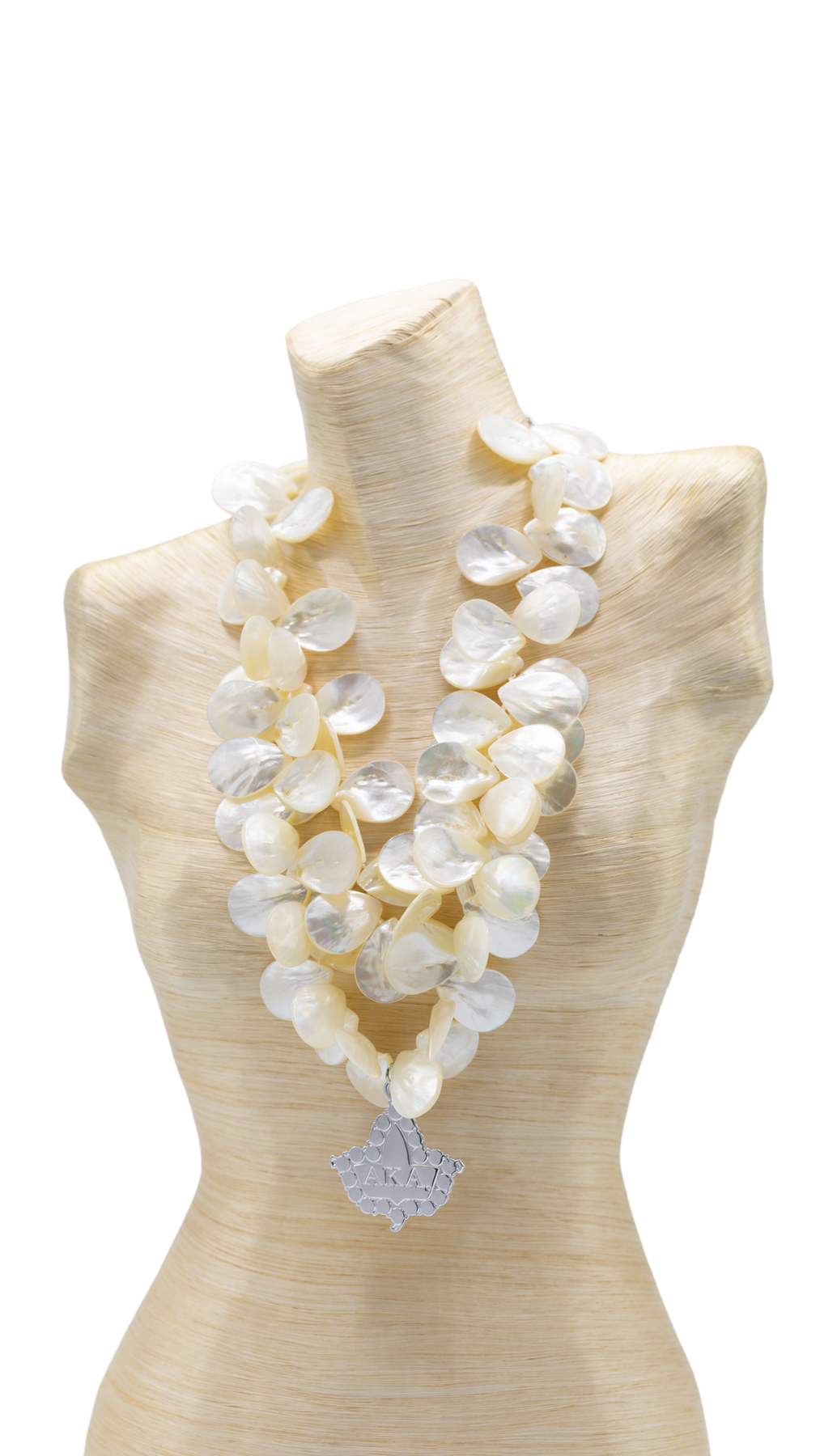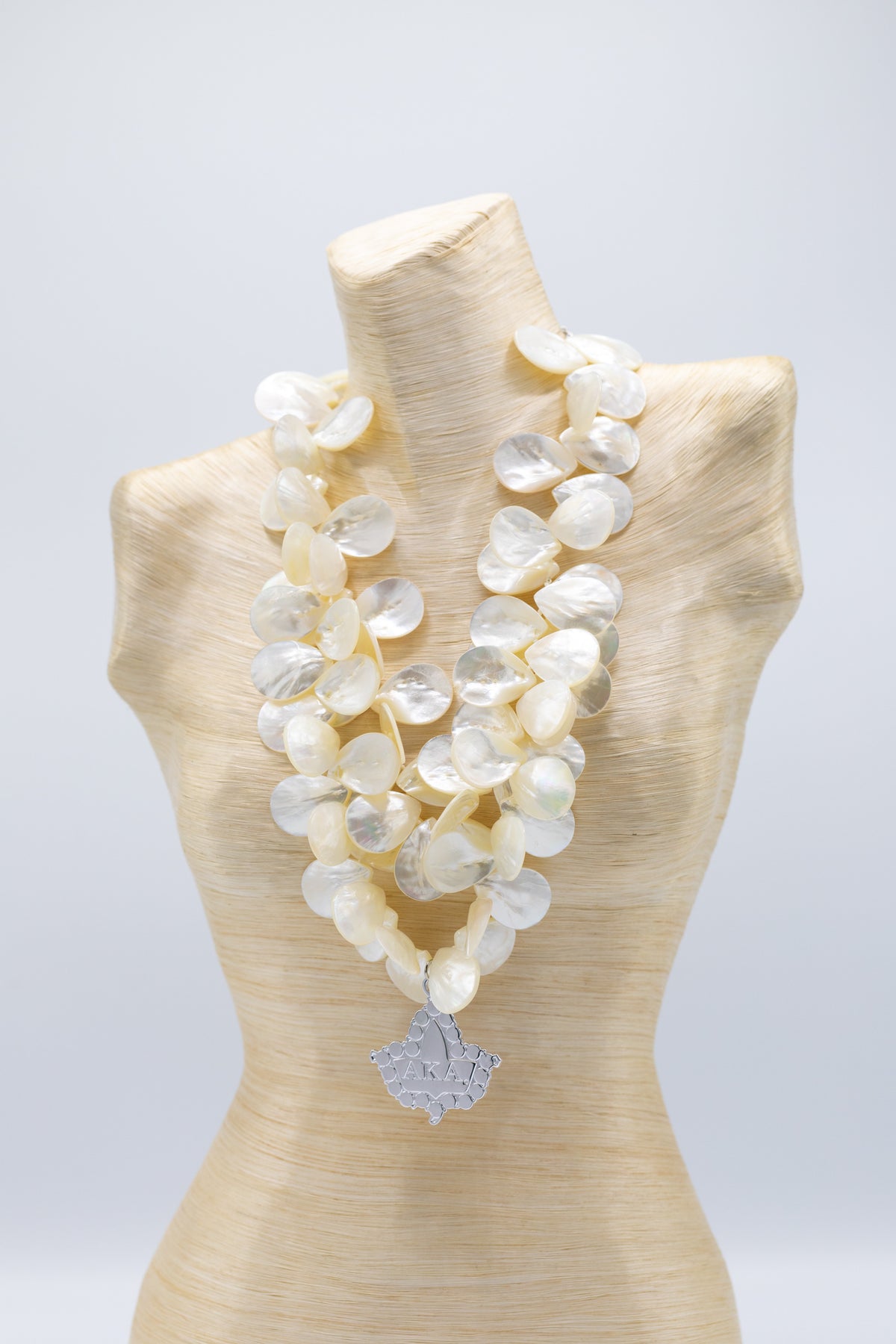 Shell necklace with  Pendant Alloy.  Each necklace is handmade so outcome may be slightly different than shown. Gems are shell 20-30 mm, very high luster. With 18K GP Clasp. 18 inches long with center drop around 4 inches