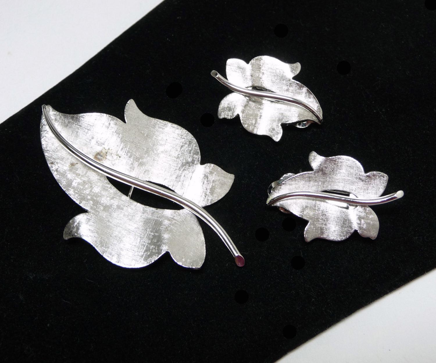 Classic jewelry in satin tone with a high polished vein moving through the center of the broad leaf. This is a lovely brooch and clip on earrings in sterling silver made by a well known company who made jewelry in the Early through Mid 1900's.