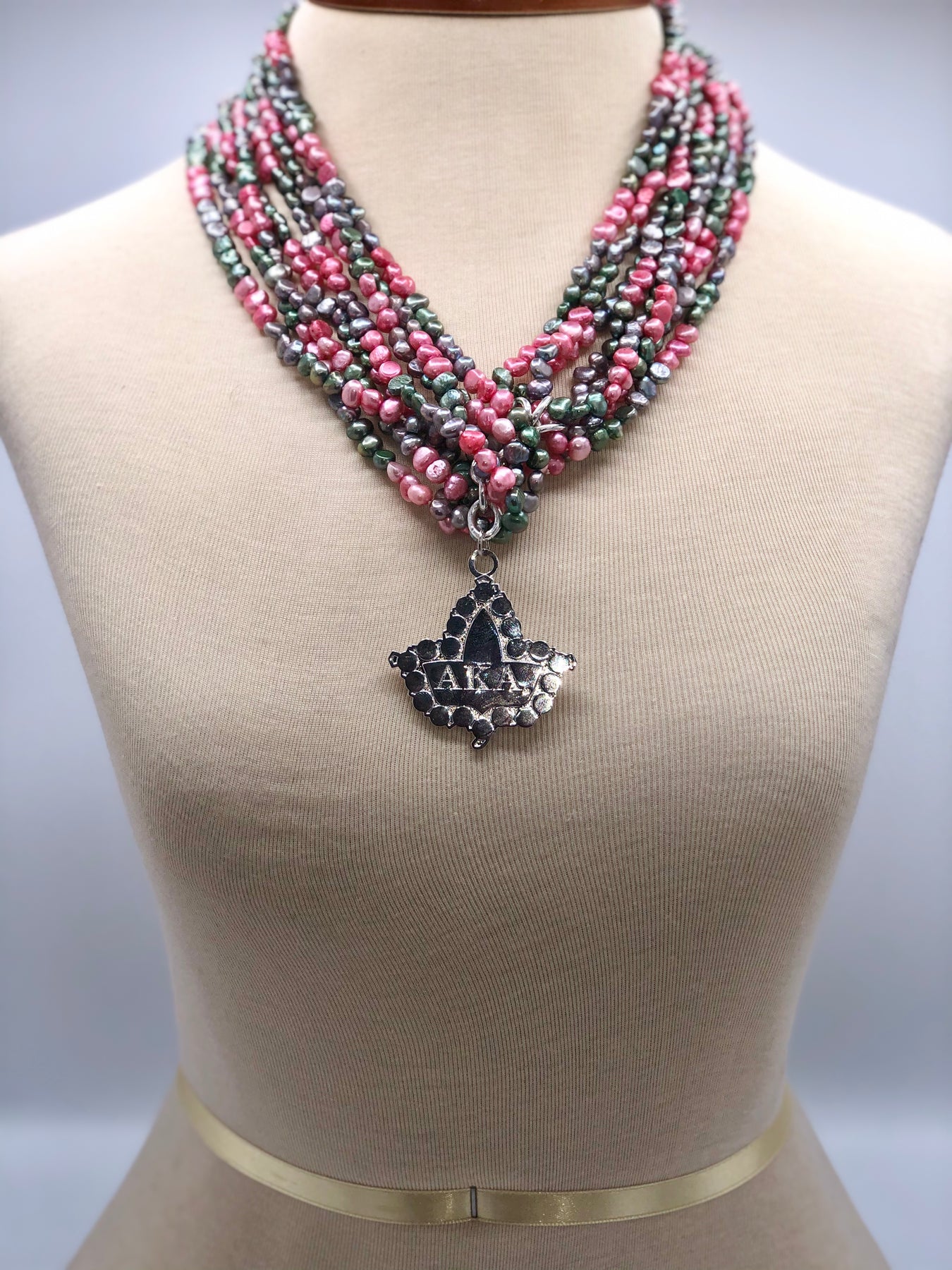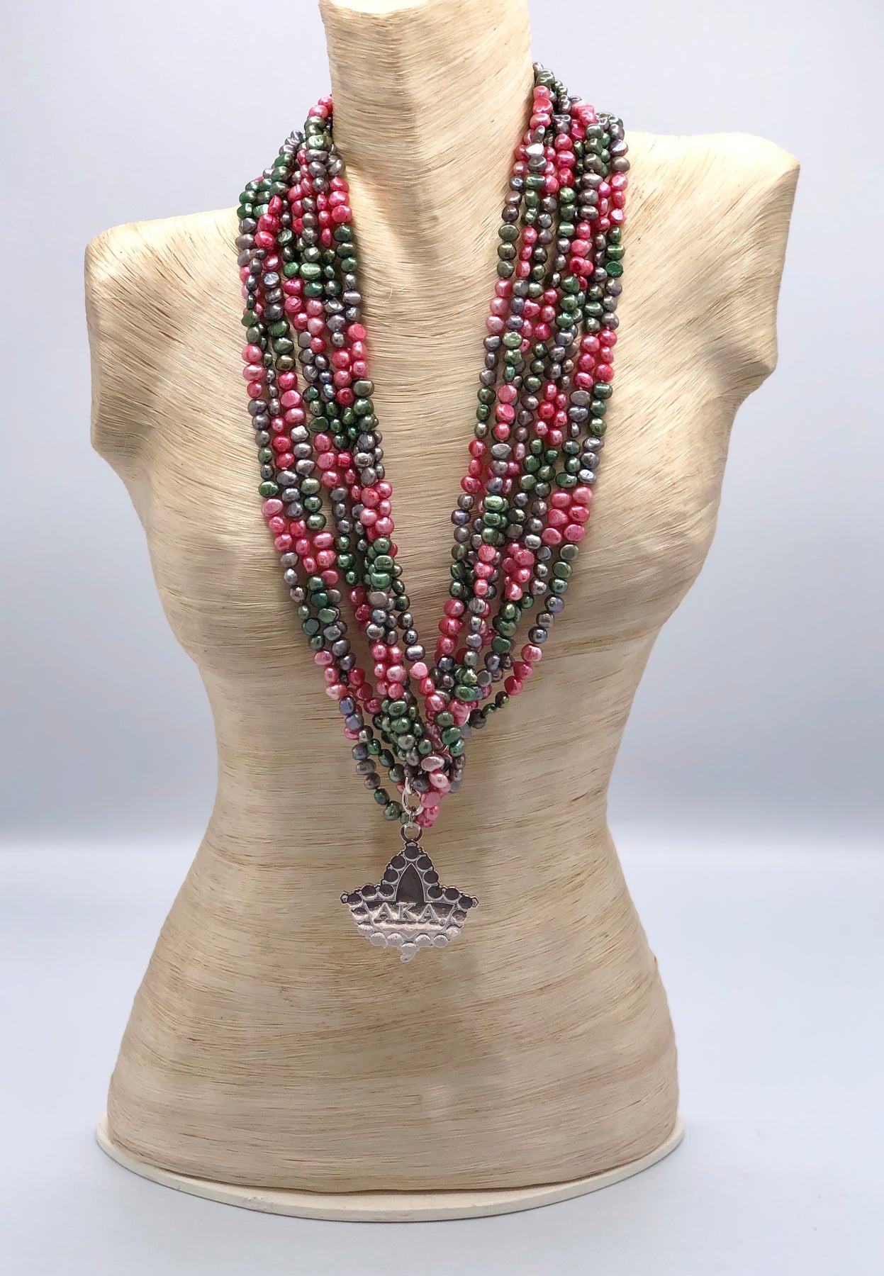 Pink and Green Freshwater Pearls with sterling links and Alloy Ivy accents. Larger mannequin shows actual size