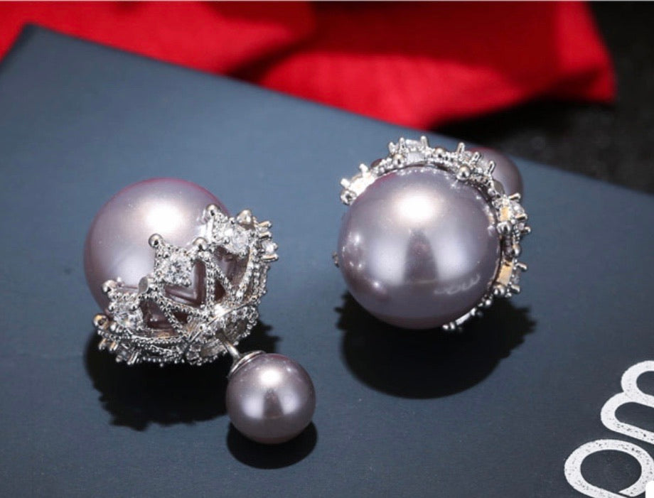 Round White / Gray Shell Pearl Double Sided Earrings