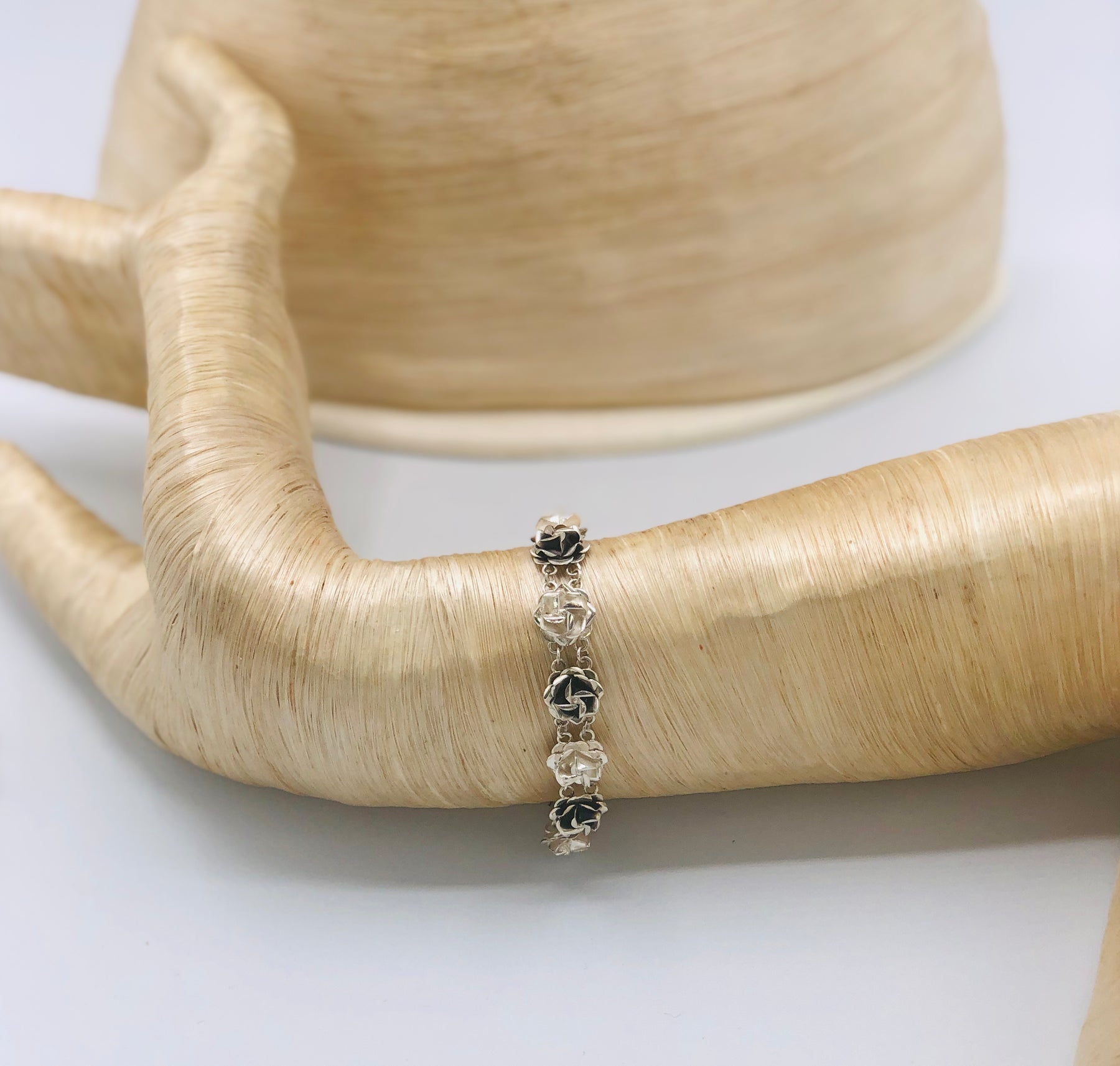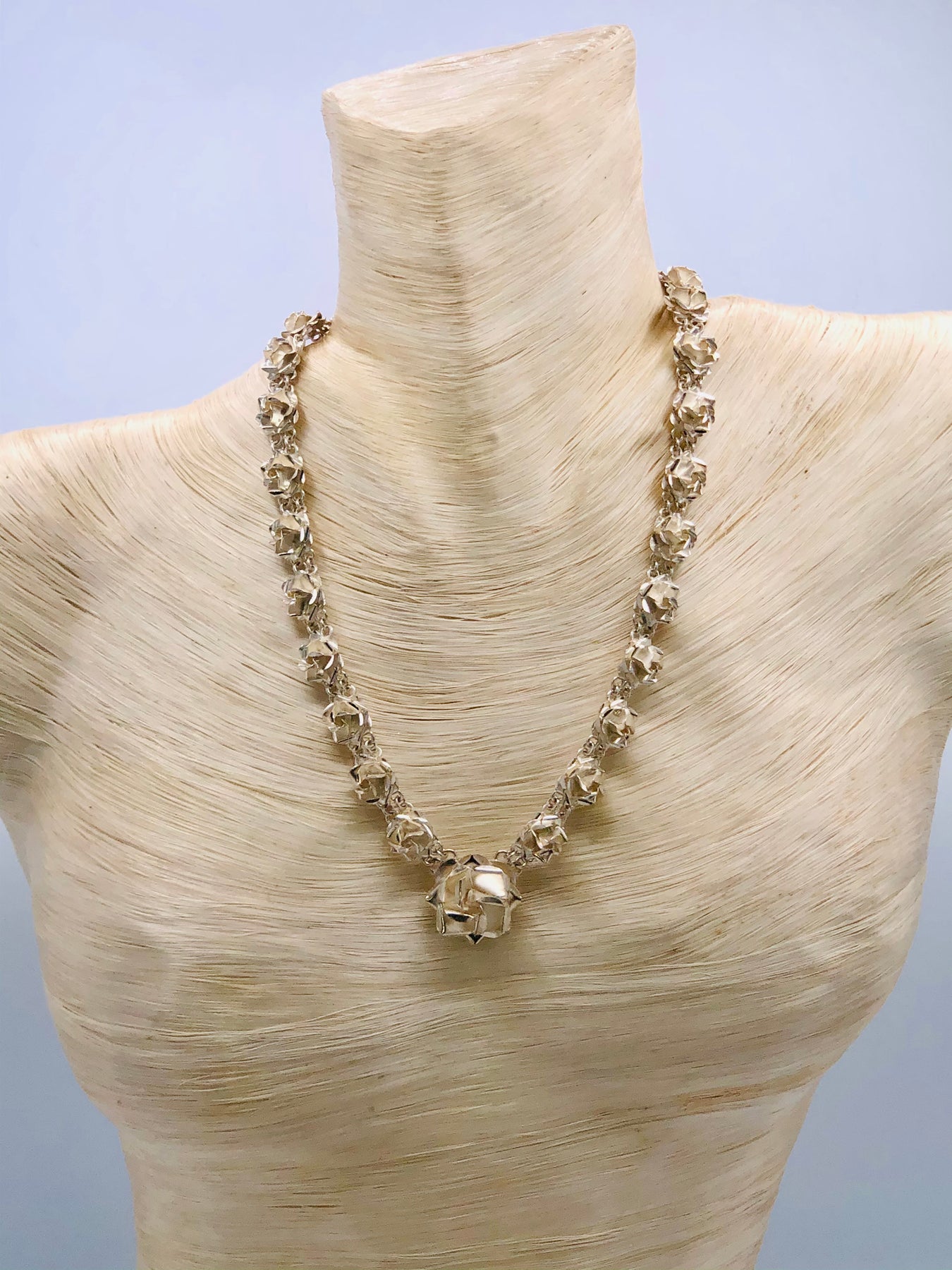 Sweet romantic, Mexican Taxco artisan hand-crafted sterling silver necklace features dimensional bilateral rose flower link chains connected by a larger rose flower center. The rose blooms are very secure and are double linked. Hook and eye clasp closure.