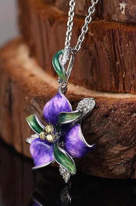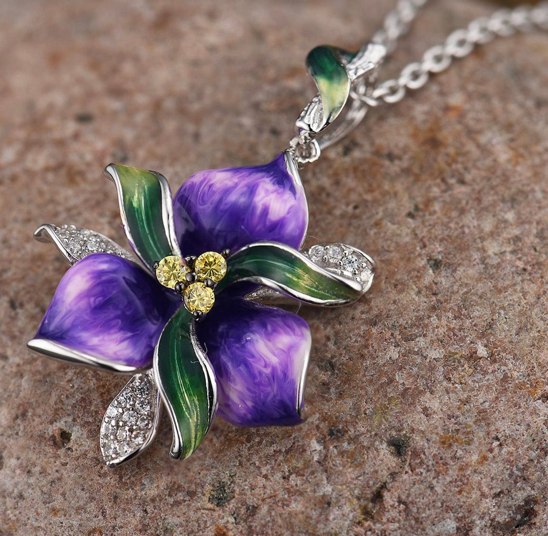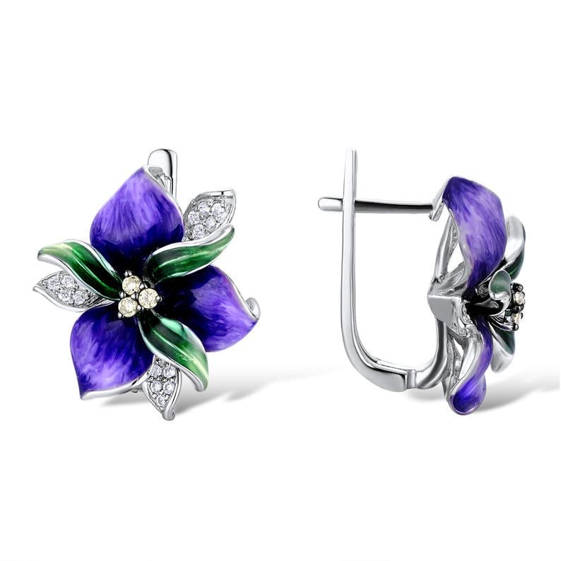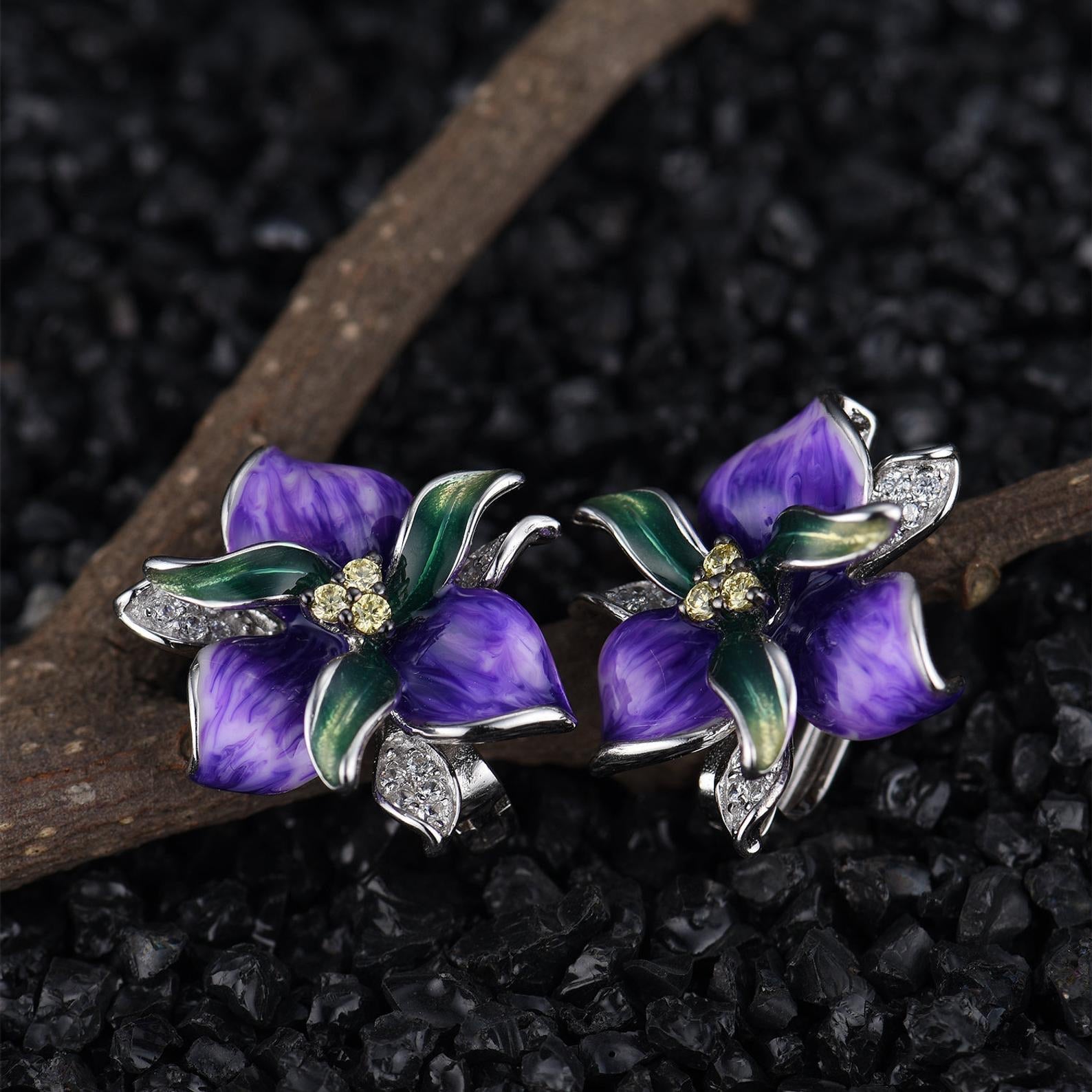 Handmade Enamel African Violet For Women 925 Sterling Silver Delicate Purple Violet with White Cubic Zirconia Ring
