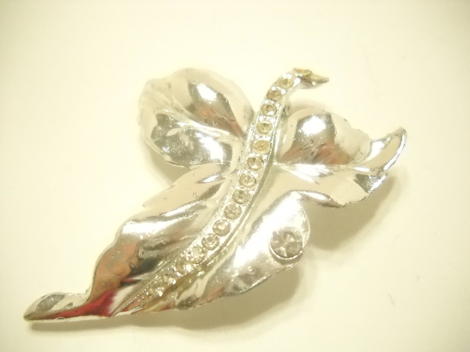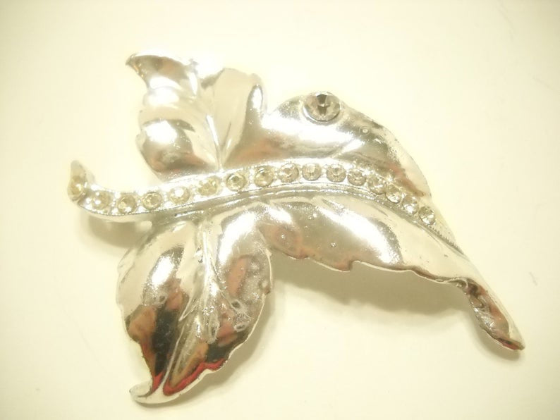 Vintage 1970s silver tone leaf brooch loaded with clear sparkly rhinestones. 2 1/4" x 3". Excellent condition. Unsigned.