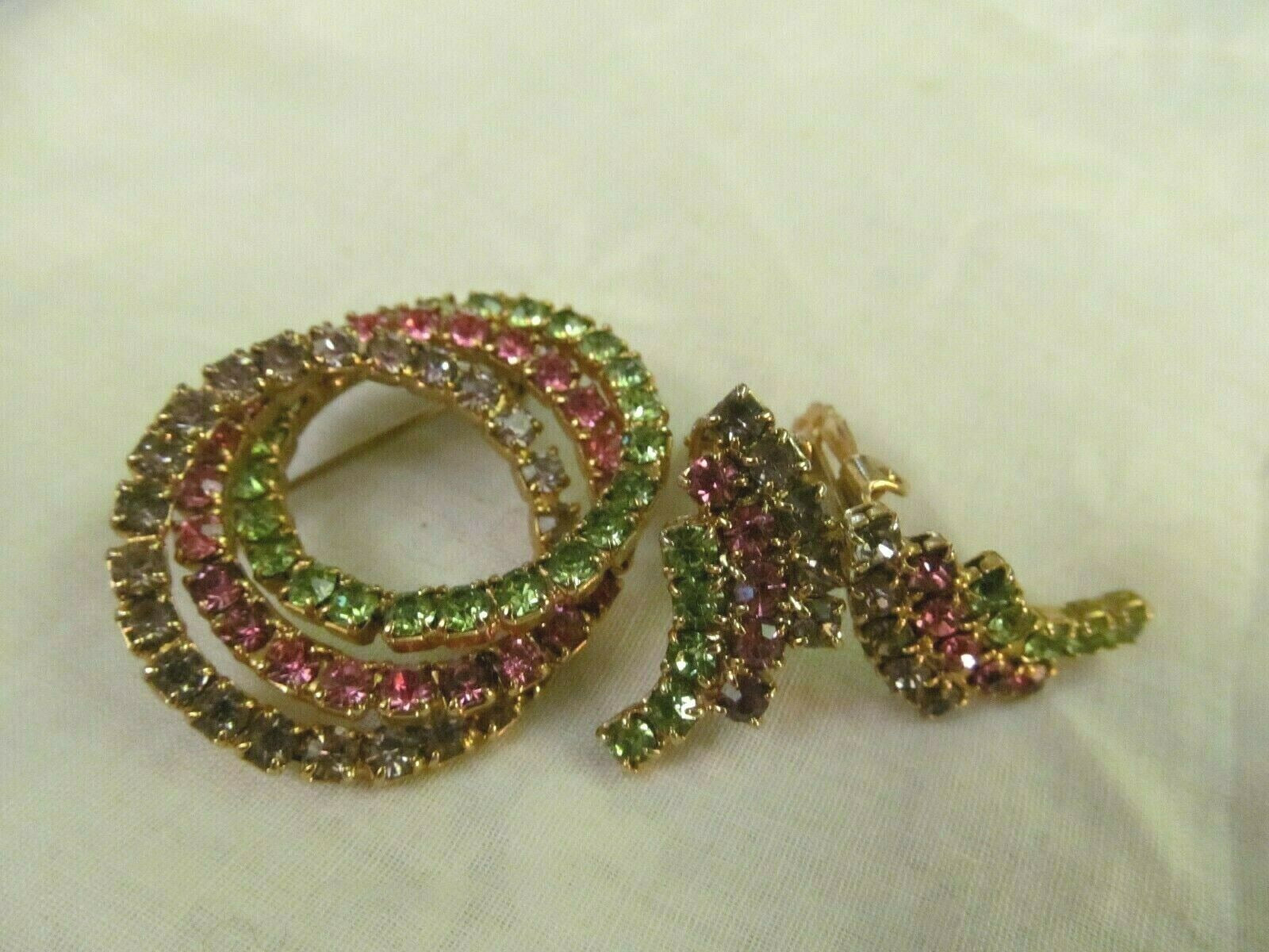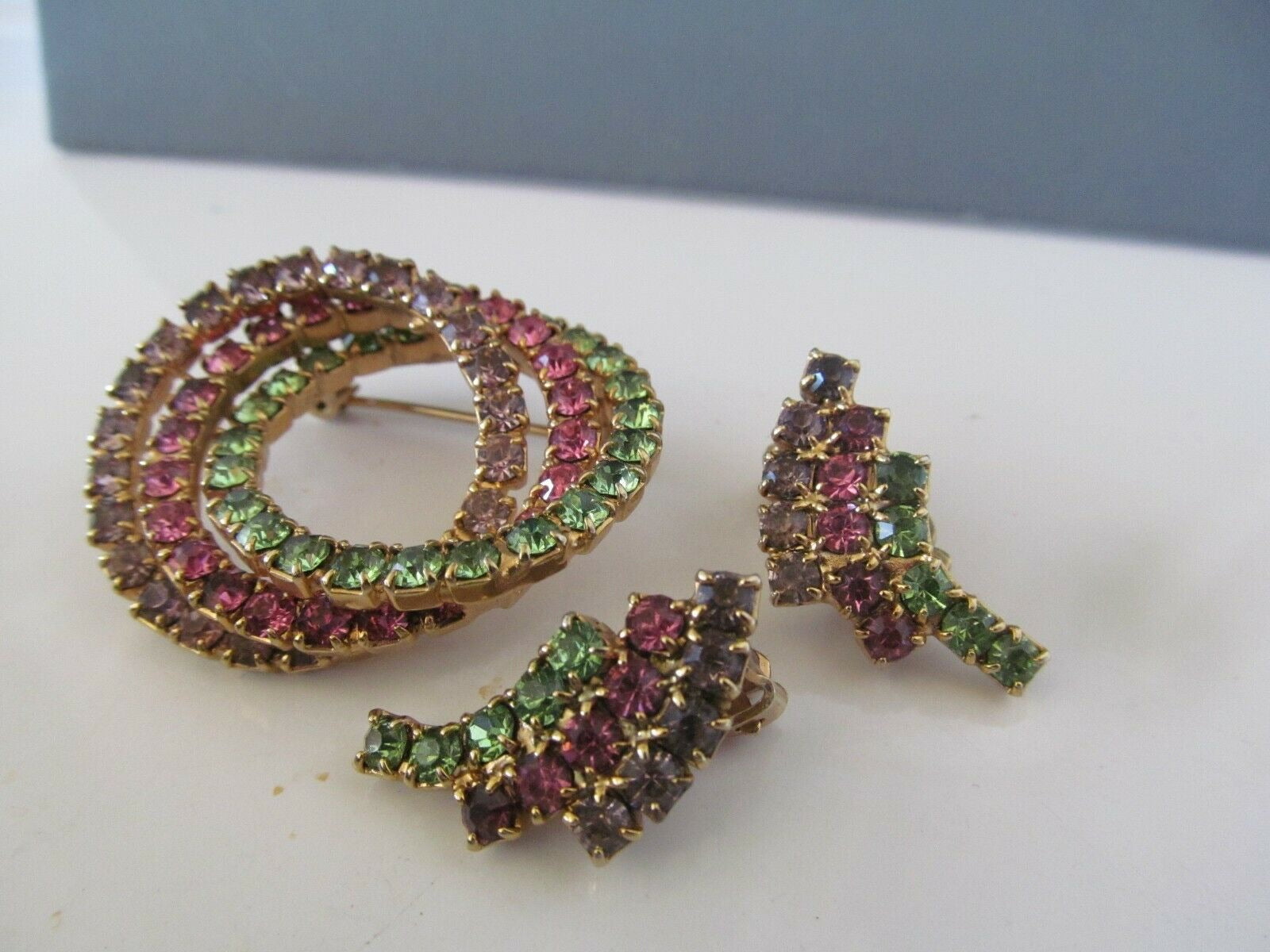 Such a pretty Set! Colors are even better in person. Lavender, Pink and Peridot Green. Brooch is 1.5" across. Heavy quality made set. Gold tone metal is gleaming. No missing stones.