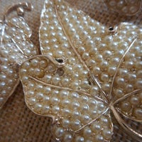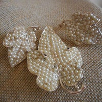 2 inches Vintage Mid Century Seed Pearl Leaf brooch w Matching Earrings Features quality craftsmanship , with emphasis to an unsigned spectacular vintage jewelry set comprised of a lovely pave seed pearl brooch with matching clip earrings. After taking photo's I noticed one small seed pearl is missing, otherwise excellent 65 year old condition. Set in gold tone alloy. Easy to put on seed pearl in. Selling as is, a terrific value & amazing set ! This lovely vintage set is a spectacular valuable treasure !