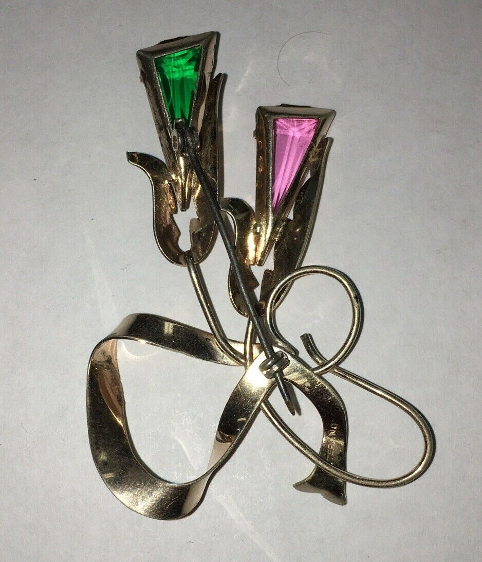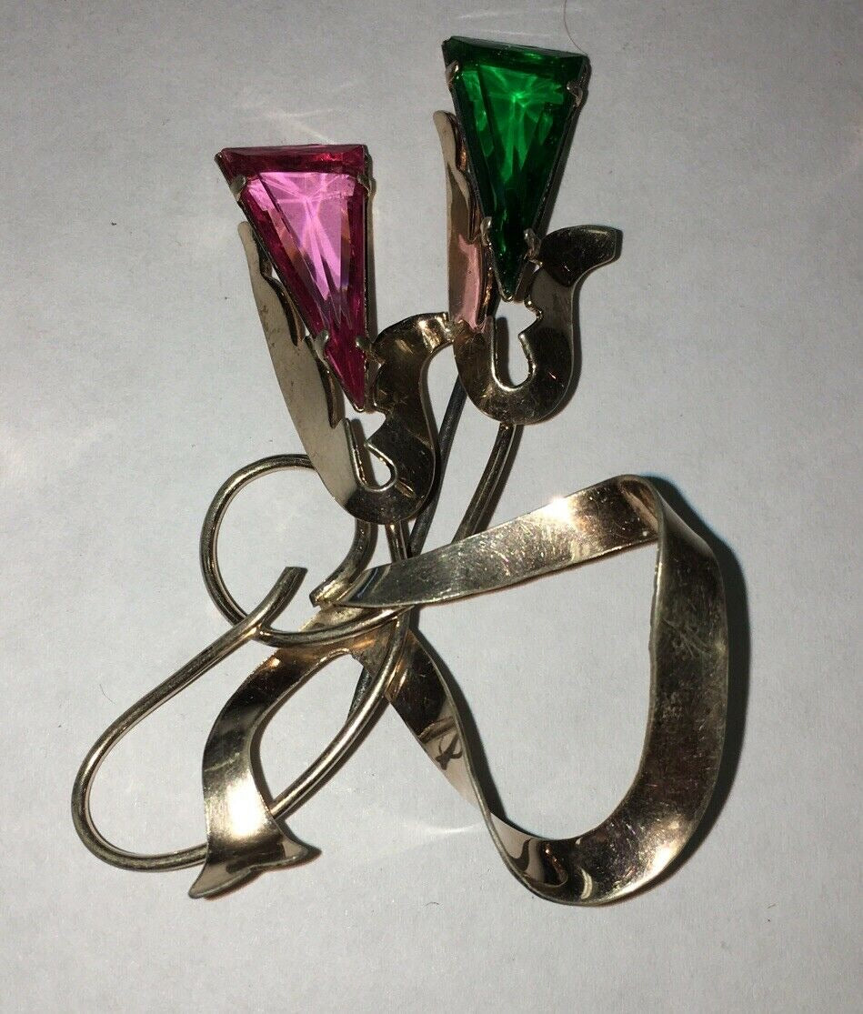 Antique Art Deco sterling silver green & pink Crystals floral pin / brooch