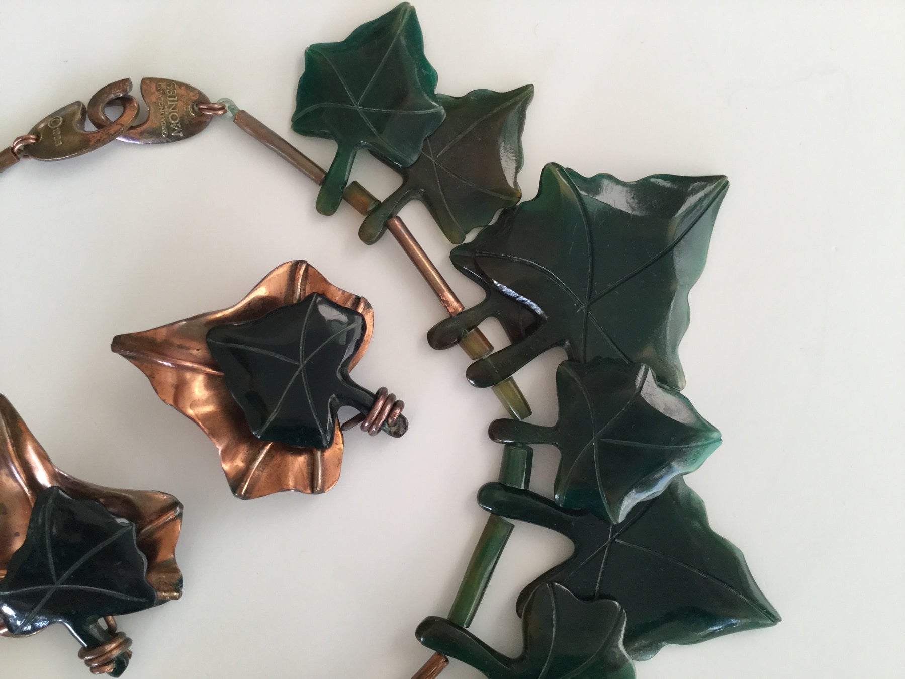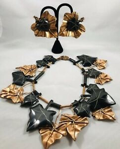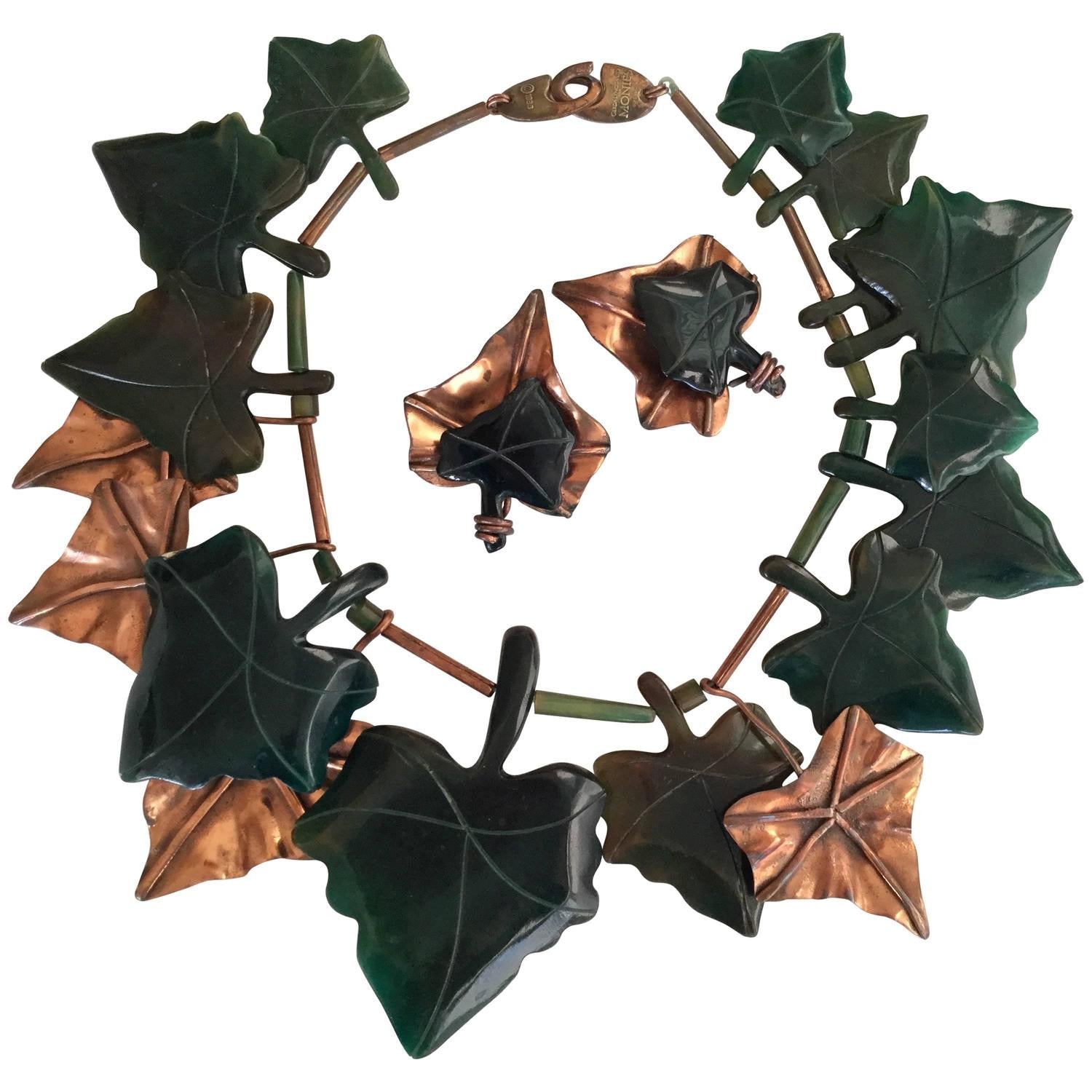 Super Rare Monies ivy leaf set. Huge bib necklace and matching clip earrings. The green leaves are made of a bakelite feeling material that simulates jade. There are also copper leaves with raised veins. Interesting asymmetrical design where one side has more green leaves and the other has more copper. The leaves are spaced by tubular copper and green bakelite beads. Excellent Condition. Signed: Gerda Lynggaard. Copenhagen. 1988. Necklace length is 17 inches including clasp. The largest green ivy leaf is 3.5 inches long by 2.5 inches wide. The green leaves gradually taper down with the smallest being 1.5 inches long. The largest copper leaf is 3 inches long and 2.25 inches wide. A simply fantastic set! So bold! Looks amazing on! Absolutely makes an outfit!