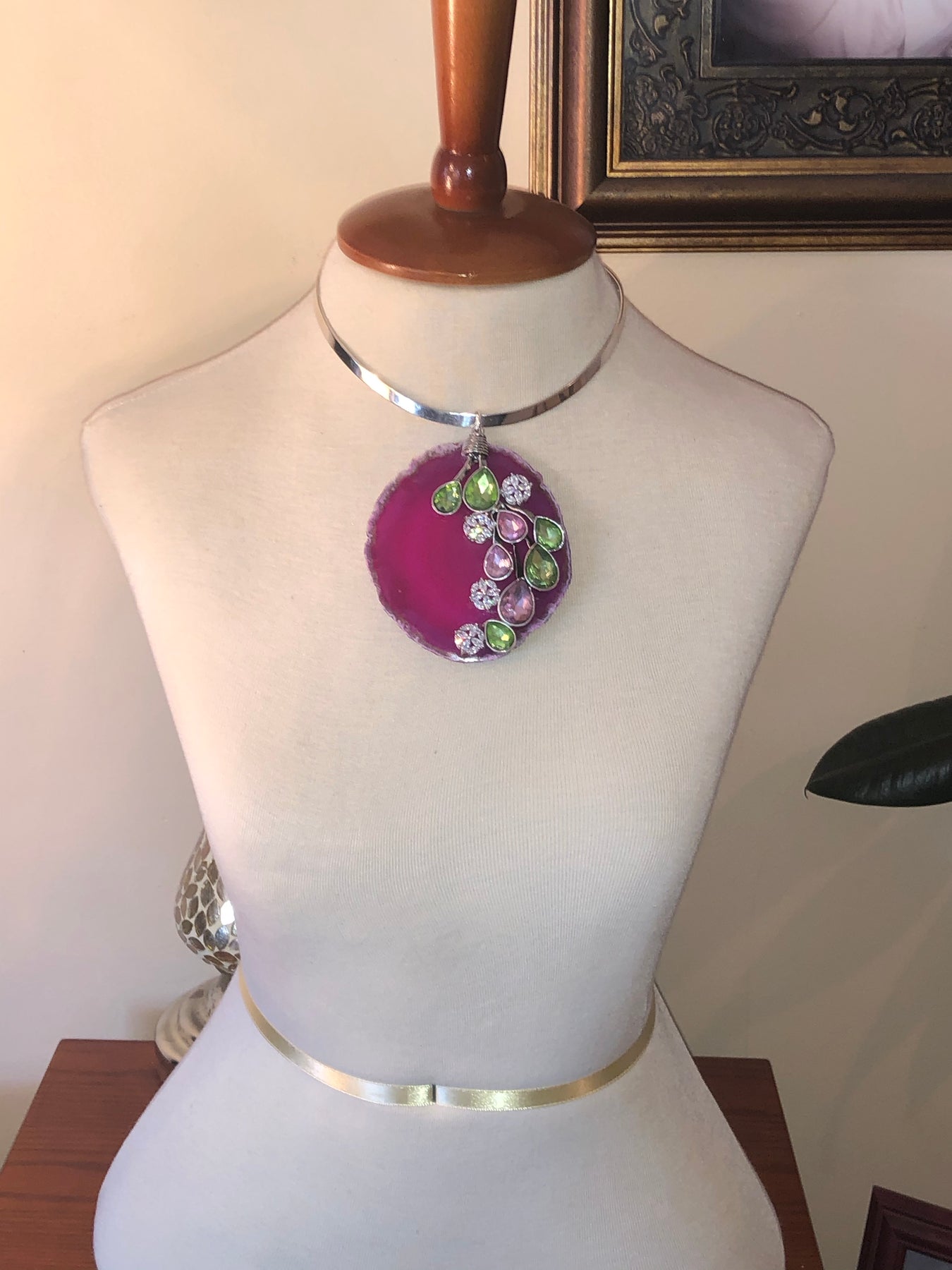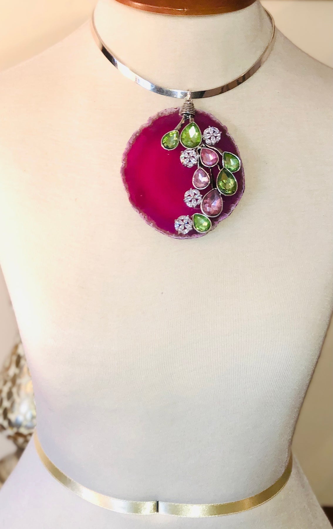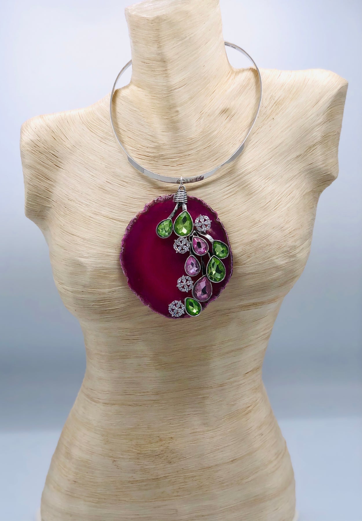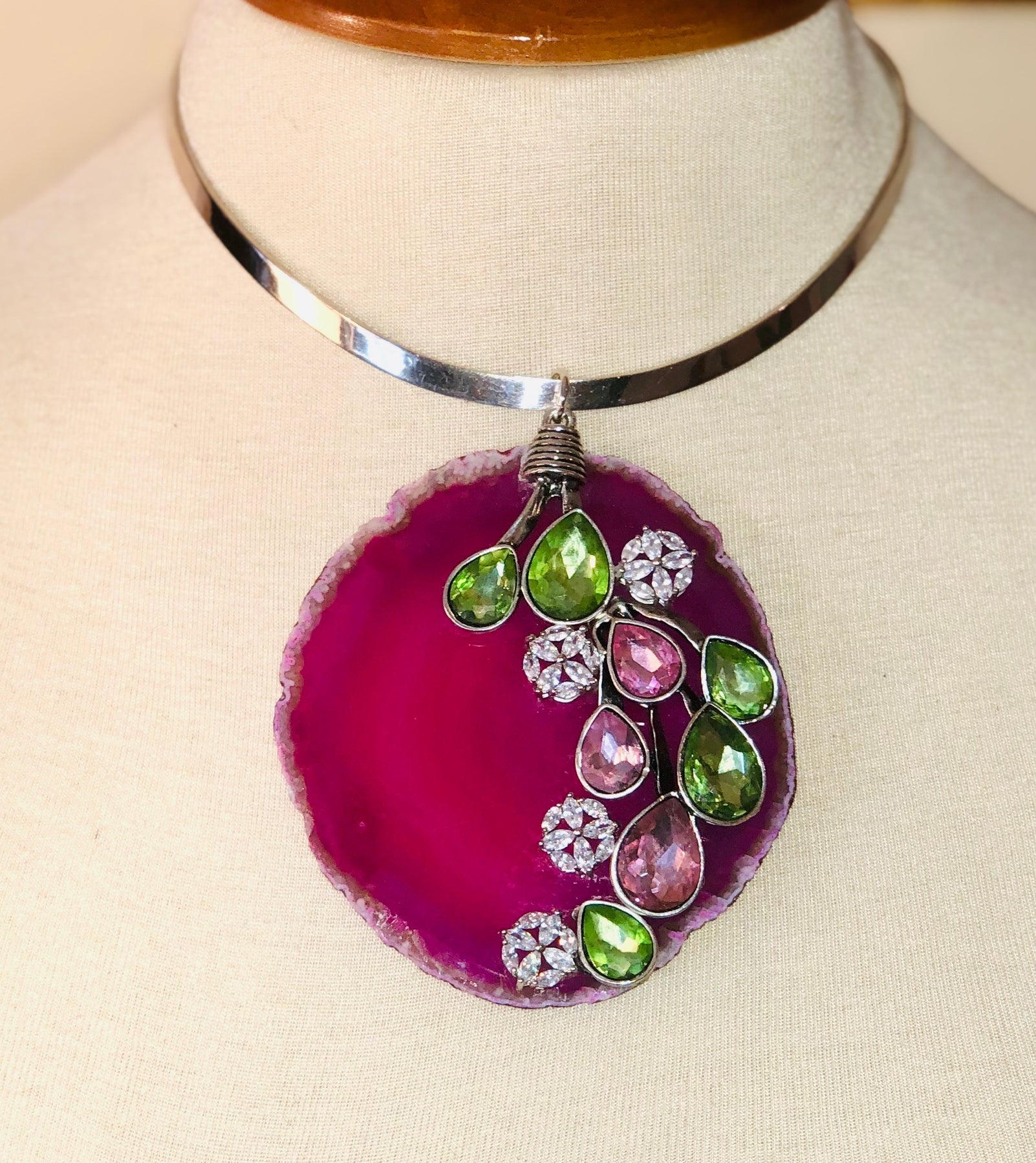 Sterling Silver choker with Agate Gemstones. The removable pendant is 4 inches long and 3.35 inches wide at its widest point; adorned with Cubic Zirconia and Crystal glass stones. The Elegant piece is one of a kind.