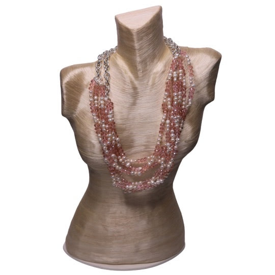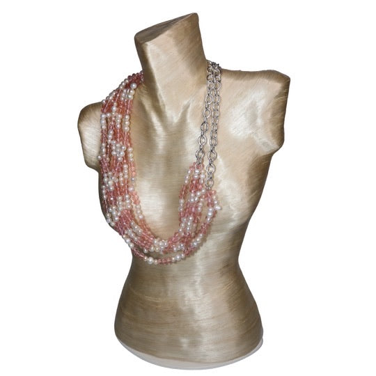 Elegant White Freshwater Pearls, Pink Crystal Lariat and Sterling Chain hardware. Can be worn multiple ways. Over 60 inches.